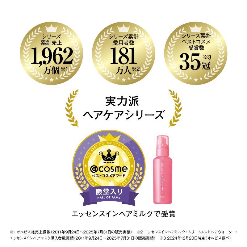 *1 オルビス総売上個数(2011年9月24日~2025年7月31日の販売実績)*2 エッセンスインヘアミルク・トリートメントヘアウォーター・エッセンスインヘアマスク購入者数実績(2011年9月24日~2025年7月31日の販売実績)*3 2025年6月30日時点(オルビス調べ)